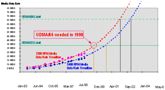 Скорость передачи данных в системную шину и из нее должна превышать внутреннюю скорость работы с поверхностью, в противном случае производительность падает — необходимы дополнительные обороты привода для опустошения буфера при считывании с поверхности и наполнения его при записи. Бороться с этим можно, увеличивая размер кэш-буфера диска или повышая эффективность его обменов с системной шиной. Первый способ связан с использованием дорогостоящей памяти и противоречит самому назначению IDE-дисков, производители как раз-таки всячески минимизируют размер кэша. Приводимый график отражает тенденцию роста внутренней скорости передачи данных, подтверждая необходимость увеличения интерфейсной скорости. Из него следует, что пределы Ultra ATA/33 будут достигнуты во второй половине 1999 года, а значит время Ultra ATA/66 пришло.