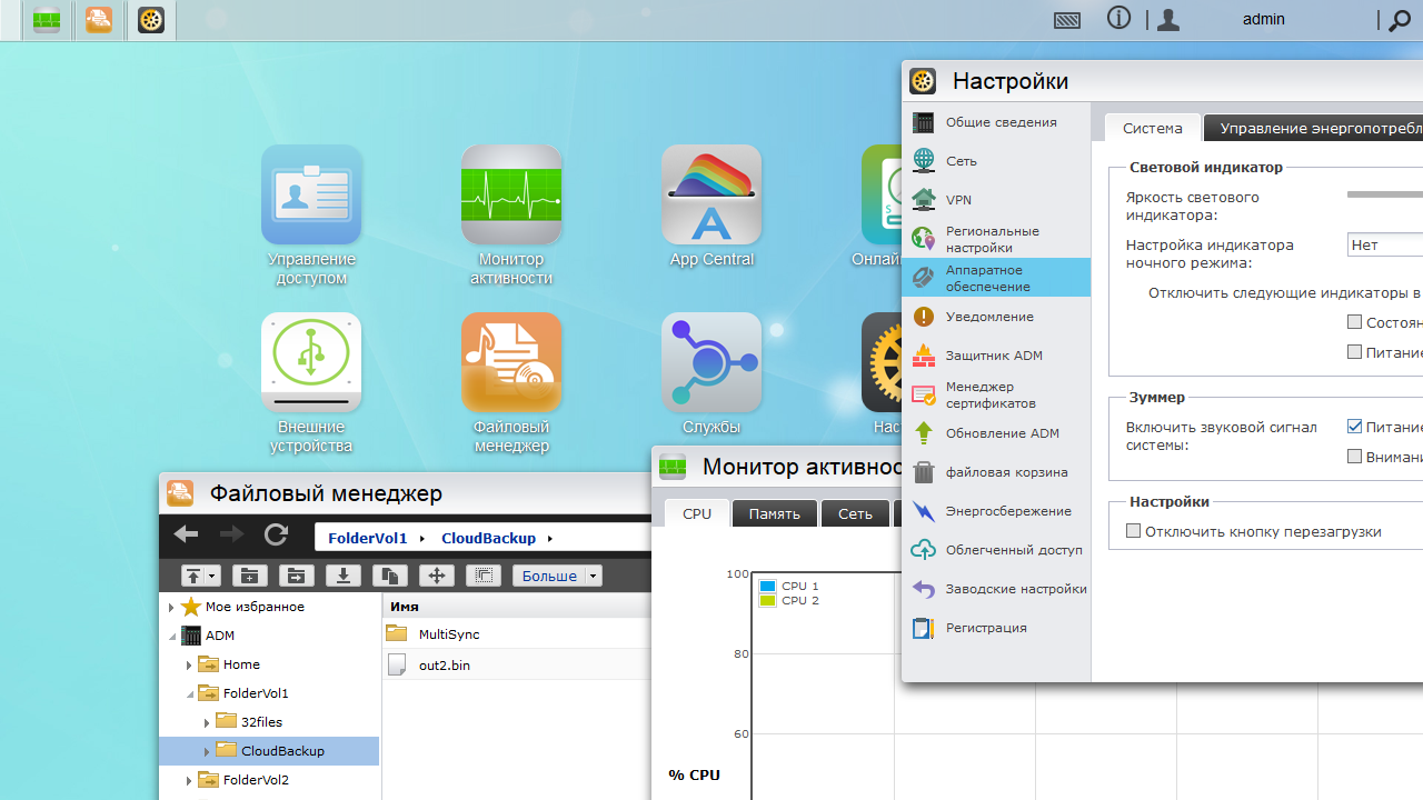 В сетевой накопитель были установлены два жестких диска WD Red объемом по 2 ТБ. Использовалась версия прошивки ADM 2.6.6RCF2, последняя доступная на момент написания статьи, с большинством настроек по умолчанию. Были созданы два однодисковых тома, несколько общих папок и пользователей.