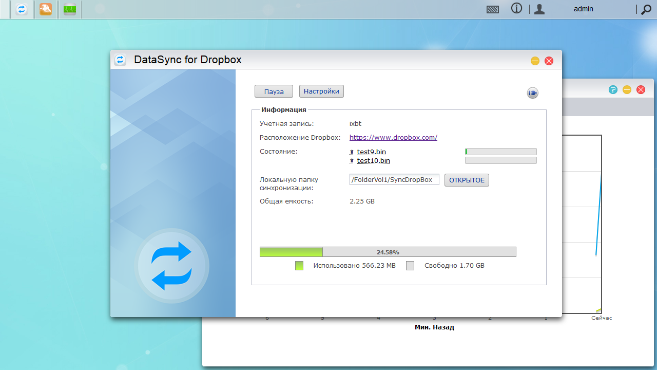 Скорость синхронизации с DropBox составляет всего несколько мегабайт в секунду. У процессора сетевого накопителя нагрузка идет на одно ядро и составляет около 30%.
