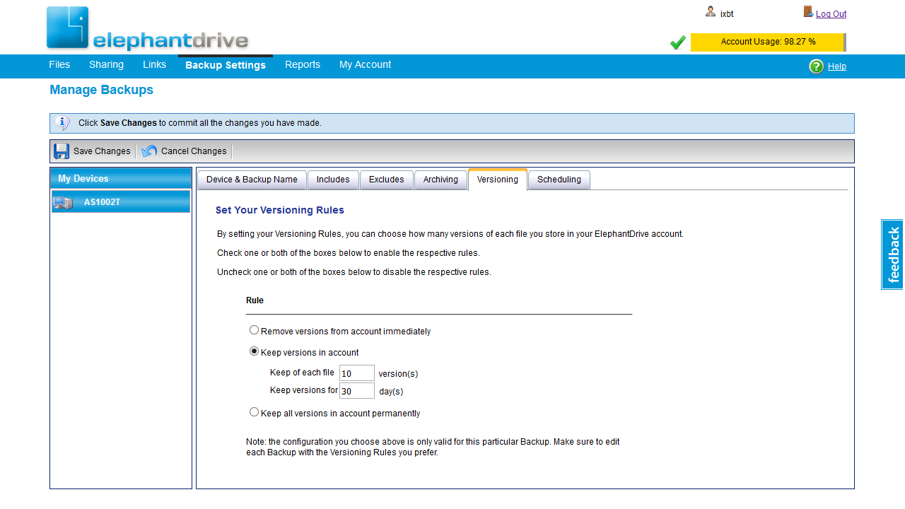 Поддержка облачного сервиса хранения данных ElephantDrive достаточно часто встречается в сетевых накопителях. Бесплатно здесь предоставляют 2 ГБ с ограничением на объем одного файла в 100 МБ, а число подключенных к аккаунту устройств не может превышать трех. Есть доступ к документам через браузер и утилиты для мобильных устройств. После подключения сетевого накопителя к сервису, управление резервным копированием и восстановлением данных с него осуществляется через общую онлайн-панель облака.