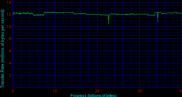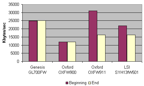 Гораздо более интересной оказалась ситуация на рынке высокоскоростных мостов IDE-FireWire. Здесь максимальная скорость могла отличаться в несколько раз. Причем такое различие я наблюдал у устройств одной фирмы, собранных на разных чипах мостов FireWire-IDE. Любопытно, что оба чипа были от одной фирмы-производителя. Ниже вы можете взглянуть на результаты сравнения.