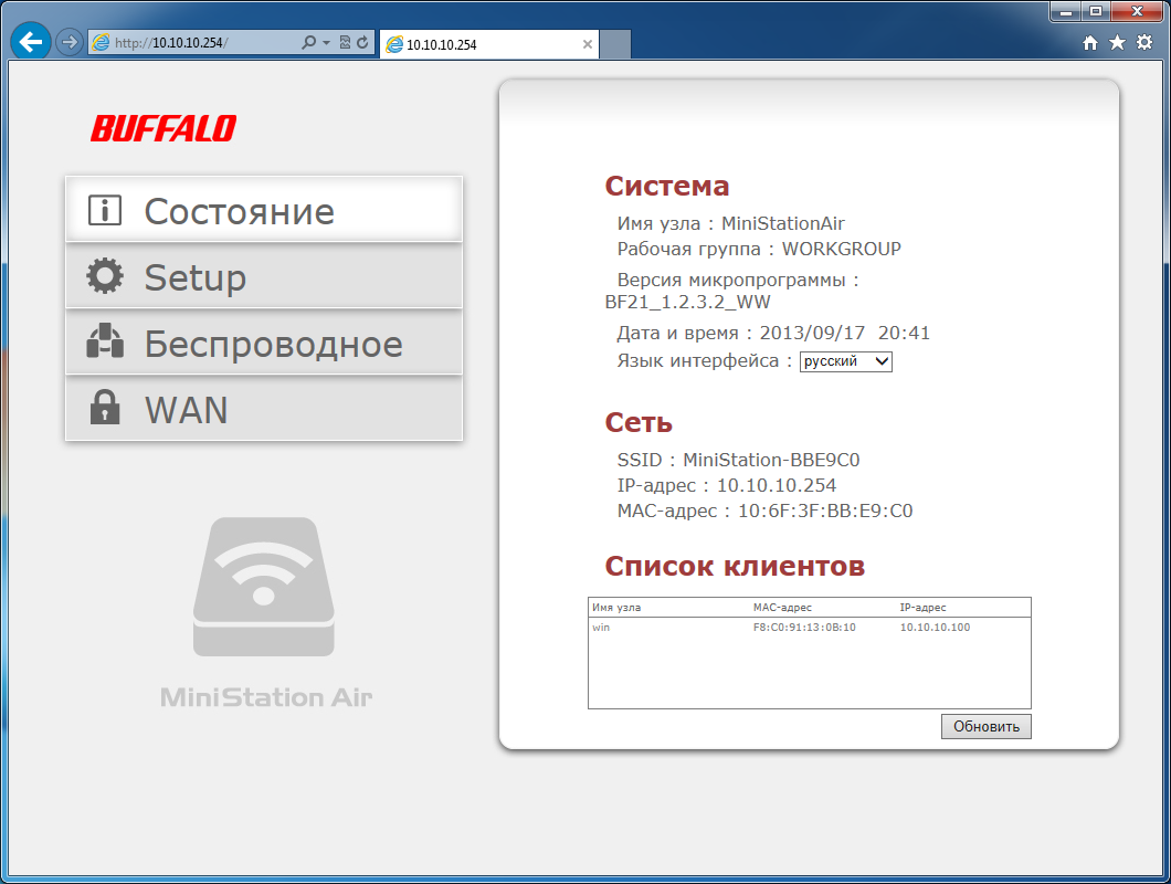 Интерфейс настройки накопителя доступен по фиксированному адресу 10.10.10.254, не имеет парольной защиты, может быть представлен на нескольких языках, включая русский. На первой странице указана основная информация о работе накопителя: сетевое имя, название рабочей группы, версия прошивки, дата и время, MAC- и IP-адреса, список подключенных клиентов.