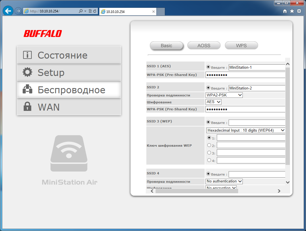 В группе «Беспроводное» находятся параметры создаваемых накопителем сетей Wi-Fi. Не очень понятно, зачем предусмотрена опция по одновременной работе четырех точек доступа. Возможно, что таким образом производитель решил обеспечить максимальные возможности подключения разных устройств. Например, третья сеть умеет работать только с WEP. Хотя на наш взгляд, сегодня этот вариант уже не актуален. Отдельные страницы позволяют включить поддержку AOSS и WPS, а также запустить соединение по второй технологии. Жаль, что кнопка на корпусе работает только с AOSS.