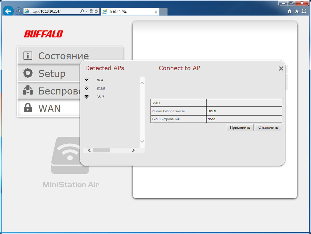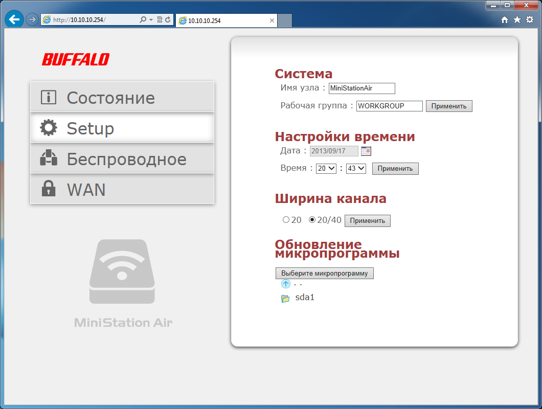 Последняя страница — WAN — используется для организации дополнительного подключения накопителя к существующей точке доступа, что позволит его клиентам сохранить доступ к интернету. Поддерживаются технологии AOSS и WPS, а также ручная настройка параметров. В этом режиме сервисы накопителя остаются доступны только по Wi-Fi, что позволяет использовать его в публичных сетях, а клиенты работают с использованием технологии NAT. Скорость доступа ожидаемо снижается, однако остается достаточной для большинства приложений — около 20 Мбит/с для одноканального режима.