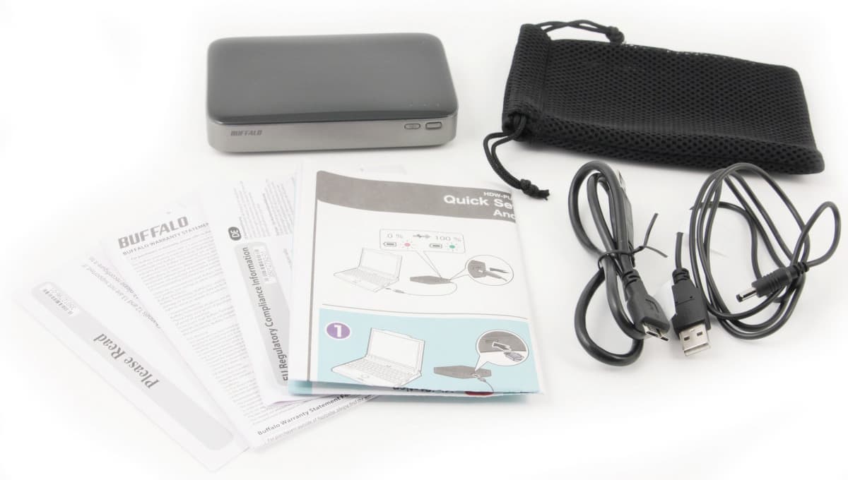 В комплект поставки накопителя входят кабели USB 3.0 и питания, неплохой мешочек для устройства и аксессуаров, листовка по началу работы на английском языке, условия гарантии. Обратите внимание, что зарядного устройства нет. С одной стороны это позволяет снизить стоимость, но вам придется или долго заряжать батарею от ПК или искать блок питания. Впрочем, учитывая современное распространение электронных гаджетов, скорее всего он у вас уже будет. Отметим, что гарантия на устройство составляет внушительные три года.