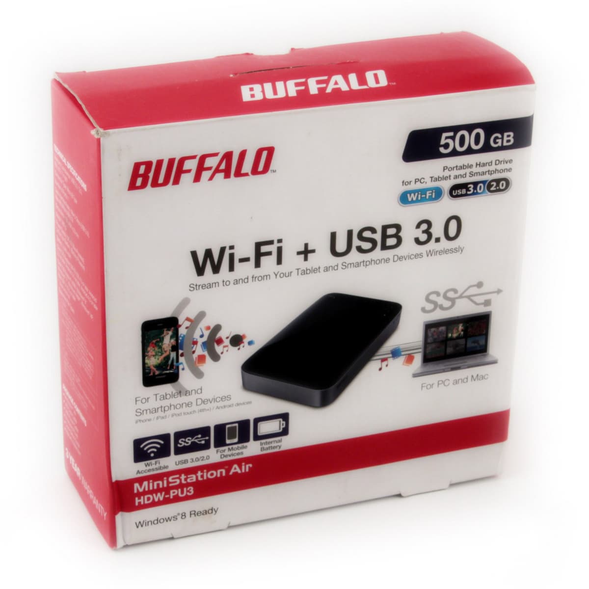 Компания Buffalo является крупным мировым производителем устройств хранения данных и сетевого оборудования. Модель MiniStation Air является представителем линейки портативных накопителей в которую входят устройства с интерфейсами USB 3.0/2.0 и Thunderbolt и объемом от 128 ГБ до 2 ТБ. Модификаций у рассматриваемой в этой статье модели нет, на рынке представлен единственный вариант с винчестером на 500 ГБ, имеющий корпус черного цвета, интерфейсы USB 3.0 и Wi-Fi, а также встроенную аккумуляторную батарею.