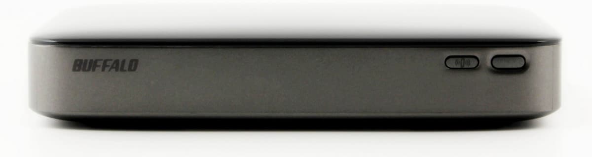 Дизайн накопителя можно назвать минималистическим, выглядит устройство просто и стильно. Под верхней панелью разместили несколько индикаторов. В одном углу находится двухцветный светодиод зарядки. В другом еще три — статус (питание, активность, низкий уровень заряда батареи), активность беспроводных клиентов, работа AOSS (фирменного аналога WPS у Buffalo).