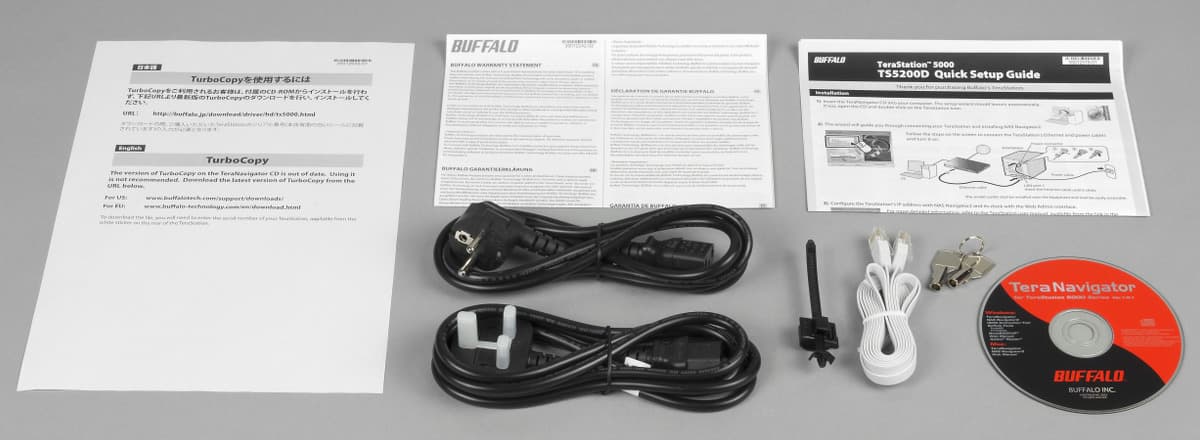 В тестировании принимает участие младший представитель серии — TeraStation 5200, рассчитанный на работу с двумя винчестерами. Как и большинство накопителей этого производителя, устройство продается в комплекте с установленными винчестерами. На рынок поставляются модели с общим объемом 2, 4, 6 или 8 ТБ.