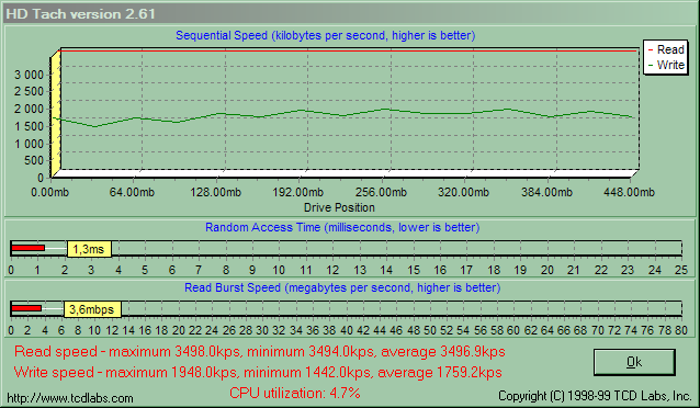 Остальная конфигурация на сегодняшний день достаточно типична и особого влияния на результаты тестирования не оказывает. Скажу лишь, что тестирование проводилось под управлением Windows XP Pro, а тем, кто решит прикинуть, какого это процессора загрузка имеется ввиду на графиках, сообщу, что это Athlon XP 1900+. Для тестирования в основном применялся HD Tach 2.61, которым я пользуюсь постоянно, и вот почему. Winbench 99 не определяет скорость записи, которая нам вообще-то наиболее важна (запись фотографий в ЦФК — та задача, когда терпеть и ждать не можно). Кроме того, этот тест иногда умудряется скосячить и со скоростью чтения. Заниматься же копированием файлов разного размера и количества тоже не очень хотелось, так как результаты такого «теста» под управлением современных версий Windows повторяемы с большим трудом, так что верить им безоговорочно не стоит. К тому же, время доступа при этом можно оценить лишь косвенно. Впрочем, HD Tach тоже имеет норов, поэтому я использовал все три метода (вдруг между ними будет большое расхождение), но, поскольку полученные разными способами результаты хорошо корреллируют друг с другом, оставил в статье лишь данные HD Tach.
