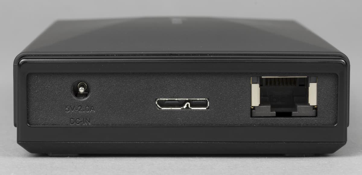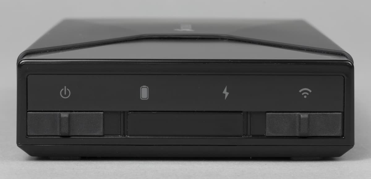 Сзади находится вход блока питания, разъем micro USB 3.0 и гигабитный сетевой порт с индикаторами активности и скорости. На передней панели разместили два выключателя — питания и беспроводного интерфейса, индикаторы работы, уровня батареи, внешней зарядки и Wi-Fi. Последние находятся на глянцевой вставке, производитель все-таки не смог полностью отказаться от такого покрытия.