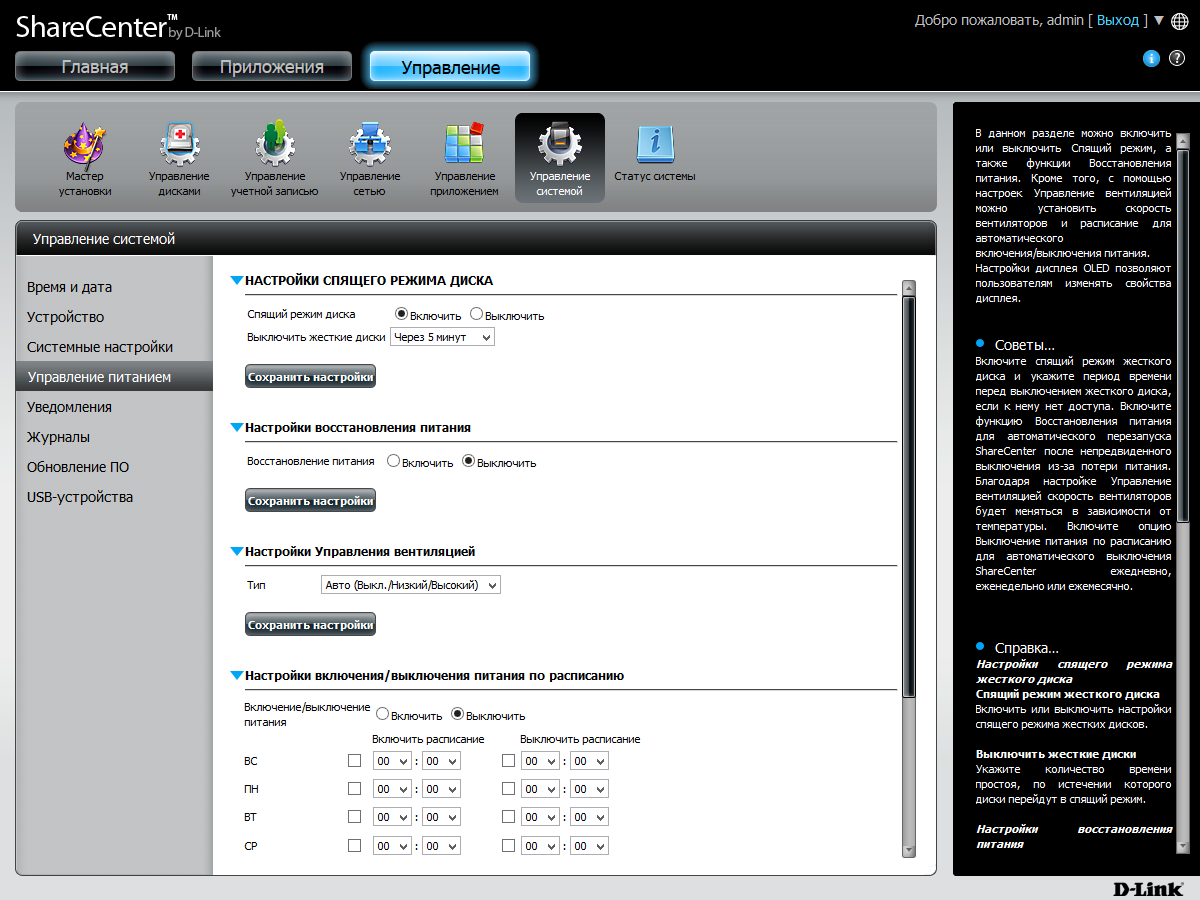 Здесь же есть кнопки для перезагрузки и выключения устройства. Среди параметров управления питанием есть включение спящего режима дисков, настройка расписания работы, автоматическое включение питания, пункт принудительного выключения накопителя в случае превышения заданного порога температуры, настройка режима работы вентилятора.