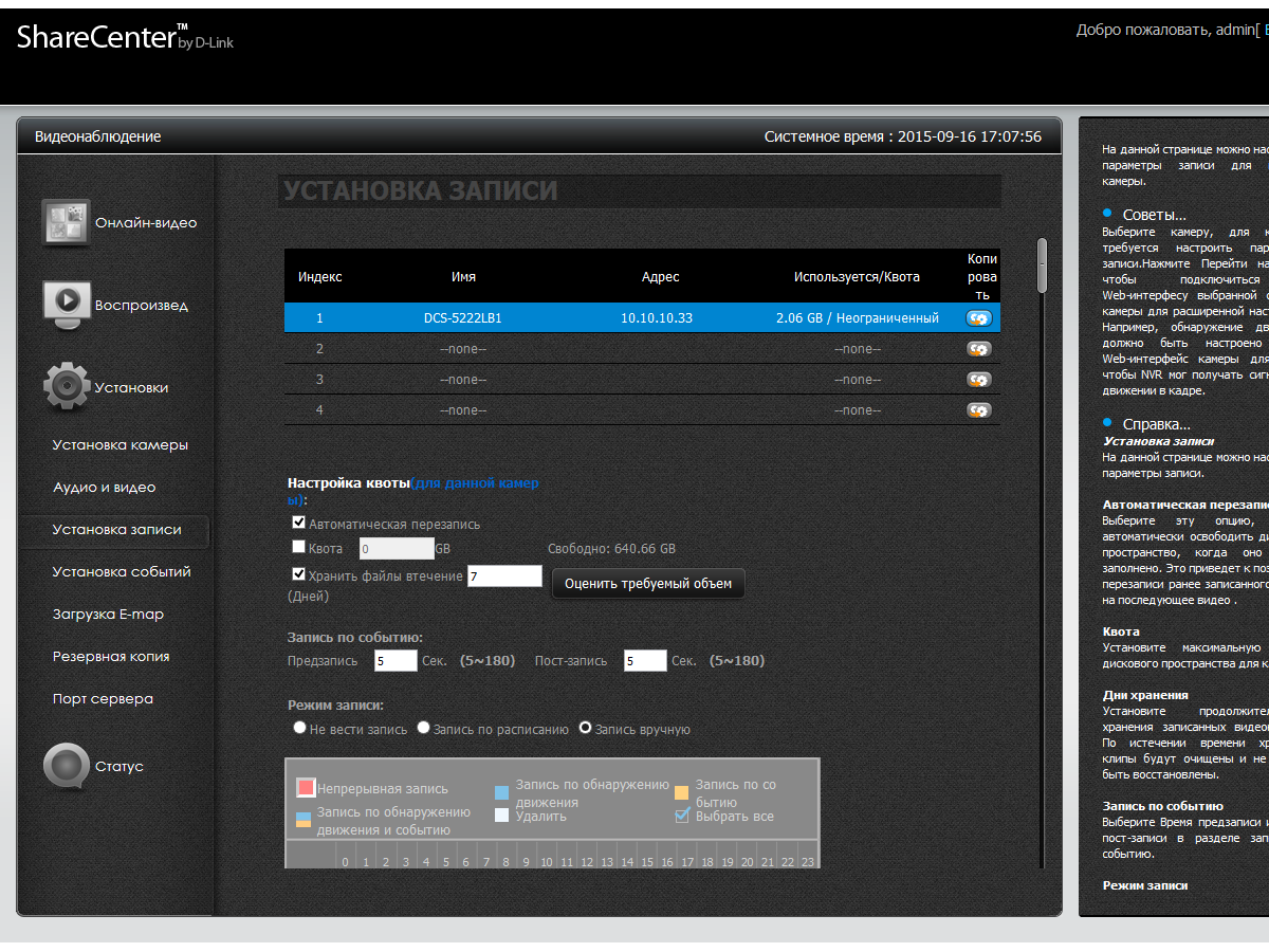 В настройках камер указывается качество, видеокодек, режим записи, параметры детектора движения, ограничения по времени хранения или занимаемому объему. Также есть настройки уведомлений по электронной почте или SMS (через внешний сервер), собственный журнал событий, создание резервных копий видеозаписей и выбор сетевых портов сервиса.