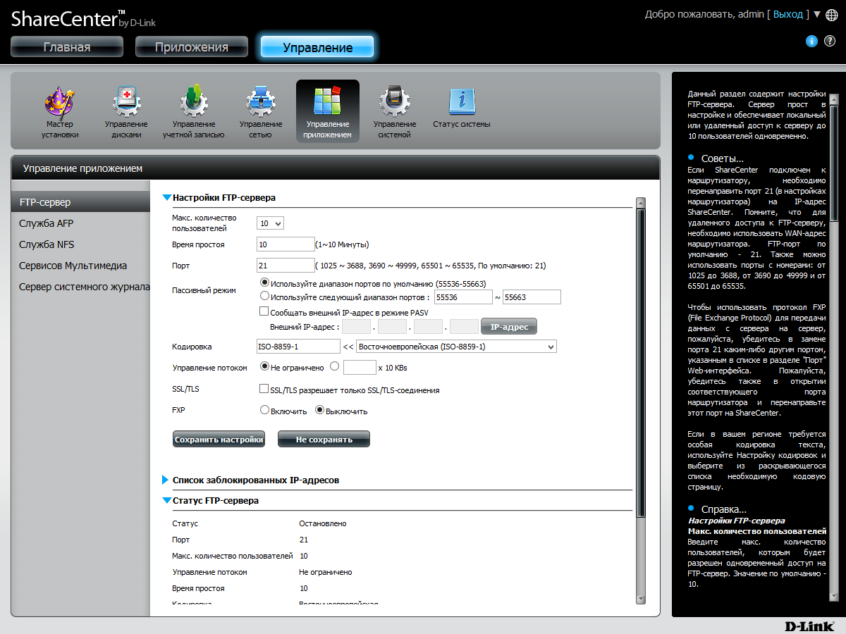 В разделе «Управление приложением», название которого немного путает, находятся параметры некоторых сетевых протоколов. Для сервера FTP можно ограничить число клиентов и скорость, выбрать номер порта и кодировку (юникод присутствует), включить шифрование и FXP, выбрать порты для пассивного режима, поставить фильтр для блокировки клиентов по IP-адресам. У AFP и NFS предусмотрена только опция включения протоколов. Заметим, что реализация AFP поддерживает и работу с программой резервного копирования Time Machine.