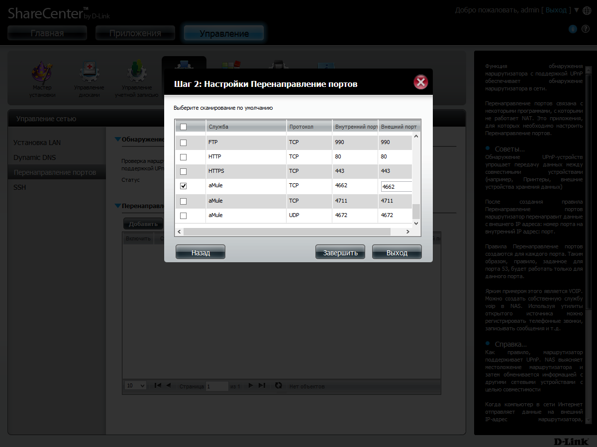 Сетевые параметры накопителя включают в себя установку IP-адресов (включая IPv6), настройку клиента динамического DNS (четыре сервиса, включая фирменные D-Link), трансляцию портов для встроенных служб через UPnP-совместимый маршрутизатор и включение протокола SSH.