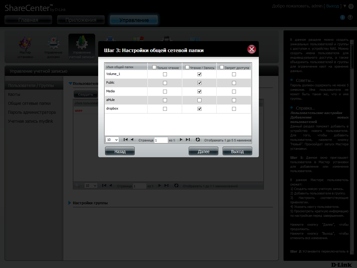 На томах пользователь может создавать нужные ему общие папки (общие ресурсы). Правда, этот процесс несколько отличается от привычных нам по другим сетевым накопителям. Для начала надо воспользоваться встроенным проводником и создать папки в файловой структуре устройства. Далее нужно будет выбрать эти папки и разрешить их публикацию по сети. Для каждой предусмотрено несколько опций, включая активацию корзины для удаленных файлов и выбор протоколов доступа.