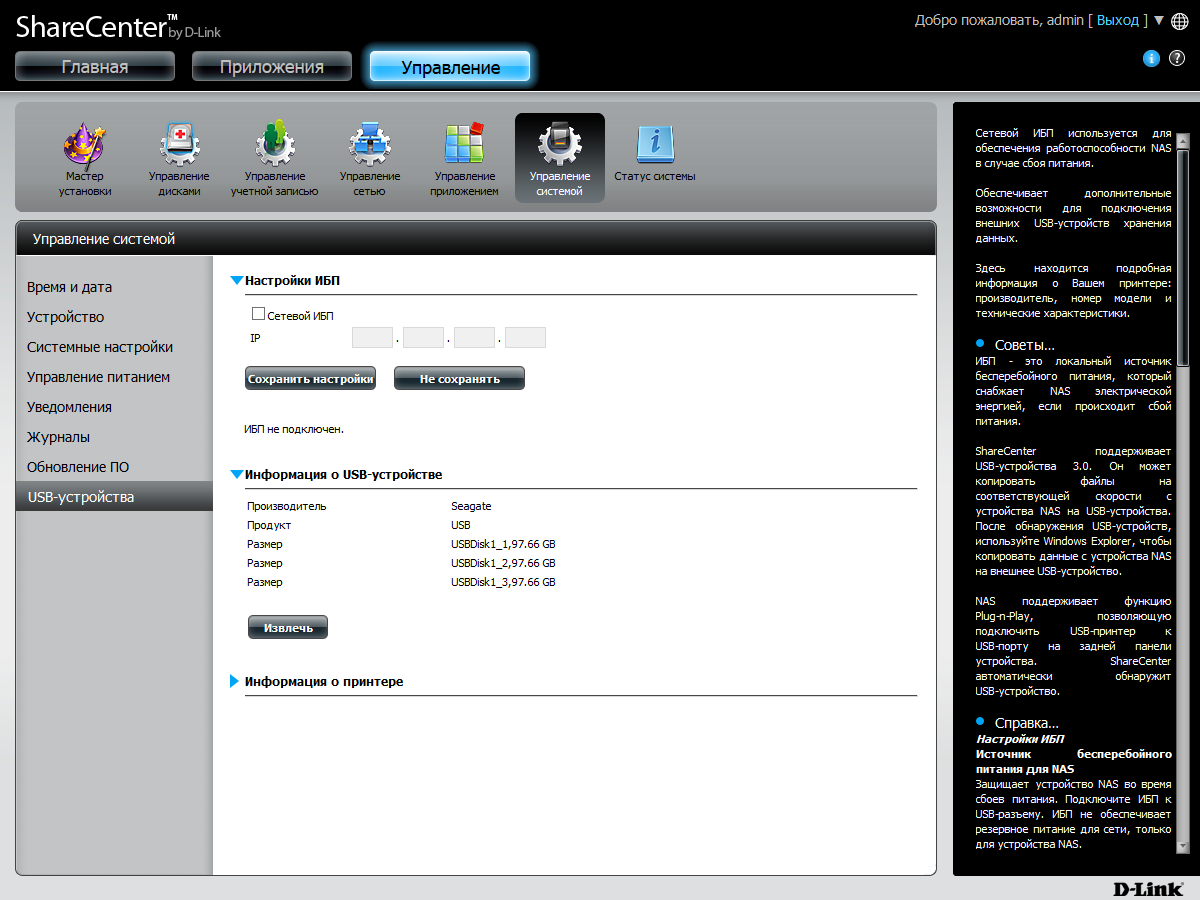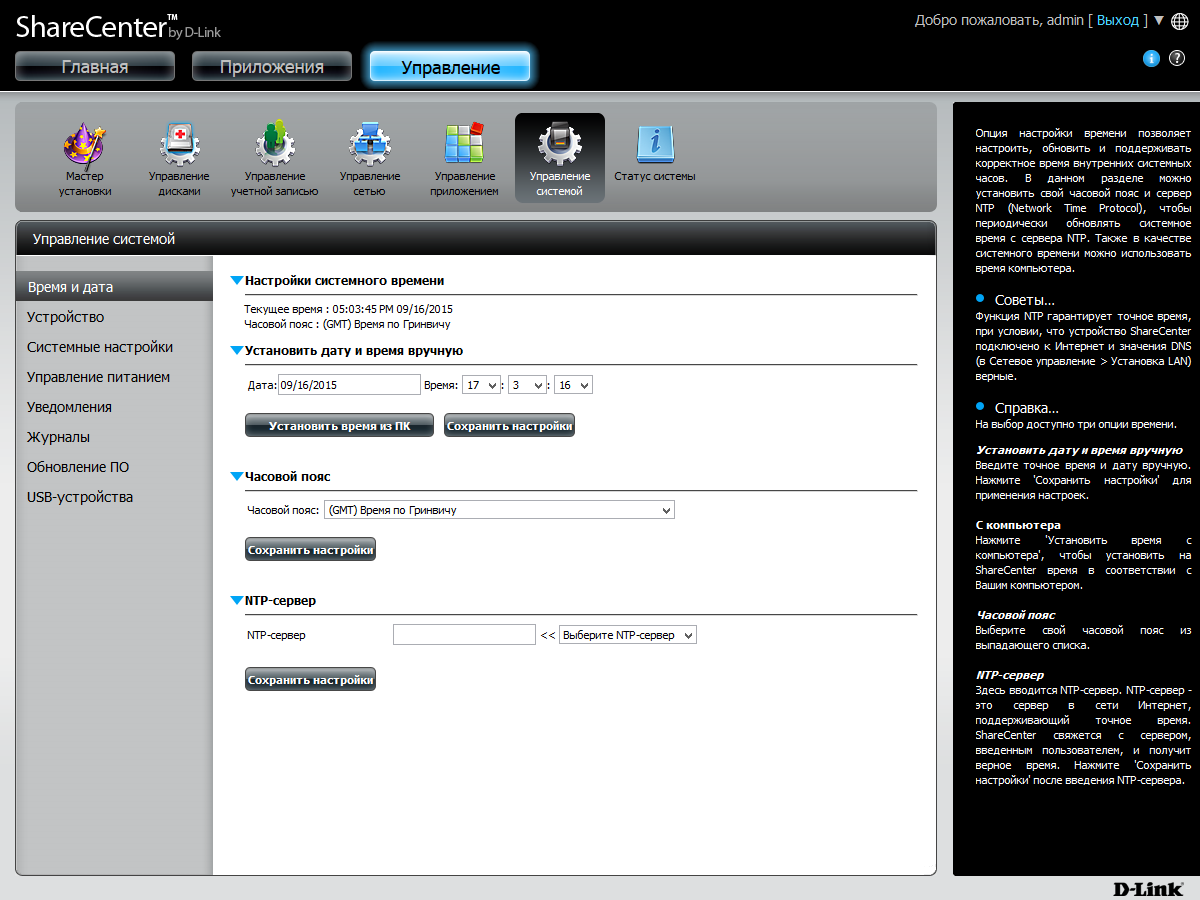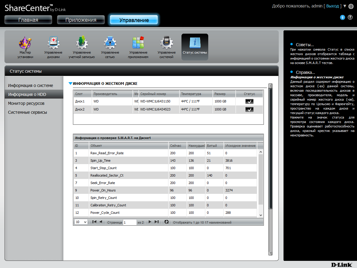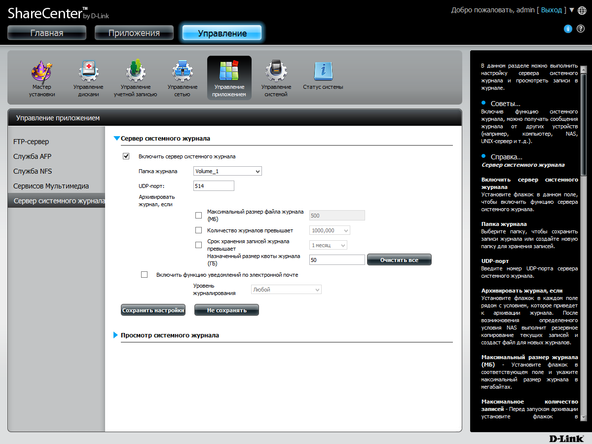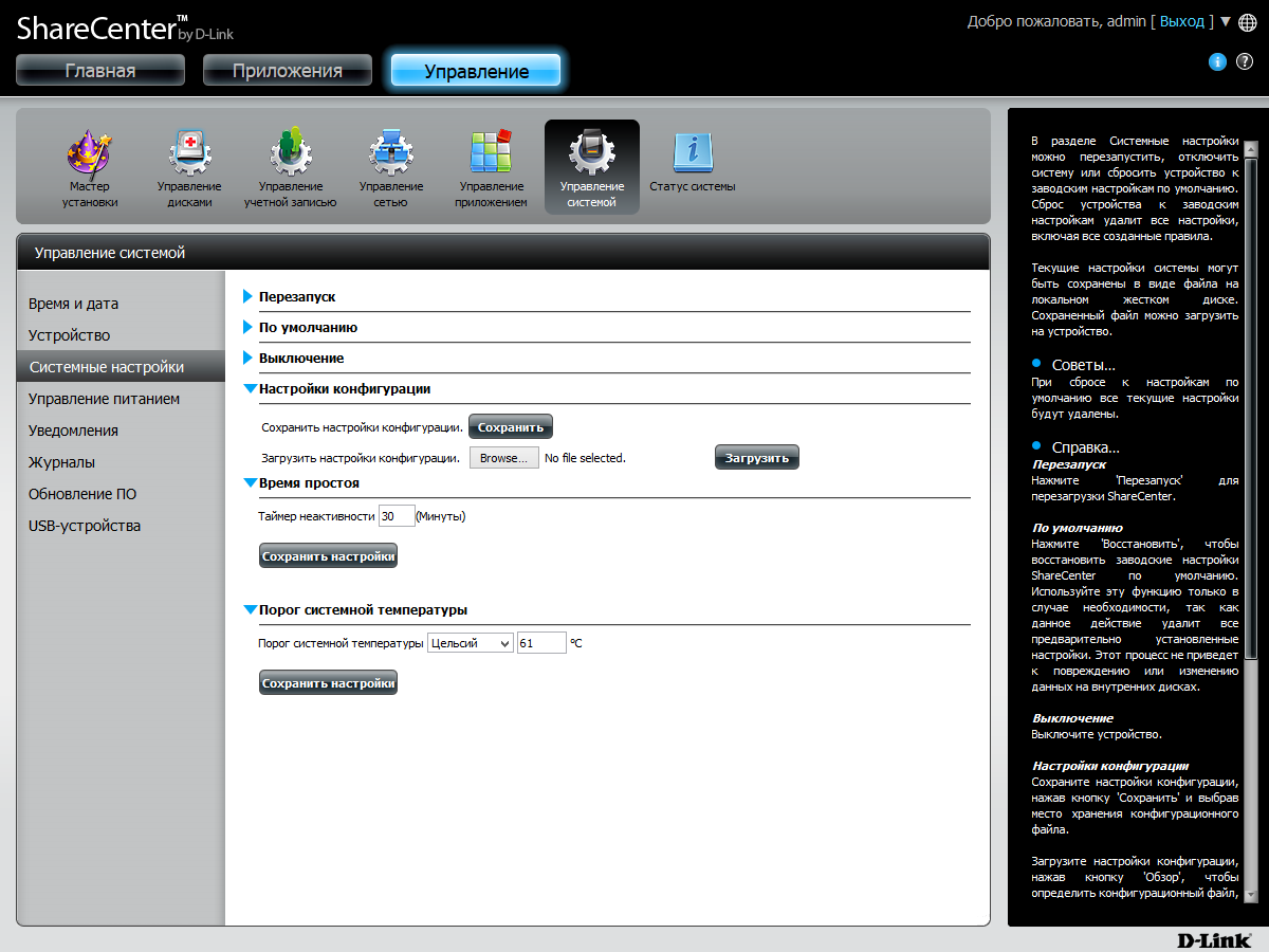 Веб-интерфейс имеет расширенный относительно традиционного формата дизайн. В верхнем правом углу есть элементы для перезагрузки и выключения устройства, а также для изменения языка интерфейса. В правой части страниц представлена информация о дисковых томах, системе и потреблении ресурсов процессора и оперативной памяти. Можно вывести здесь и журнал событий. А при открытии страниц с настройками, этот блок переключается на встроенную справочную систему.