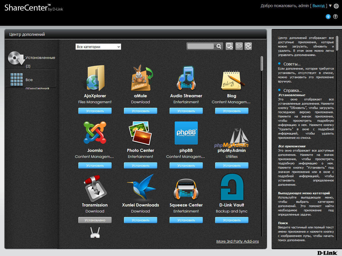 Из интересных программ отметим системы загрузки файлов aMule, Transmission и Xunlei, системы управления контентом Joomla, phpBB и WordPress, программу трансляции аудиопотоков Audio Streamer (на базе проекта Icecast), менеджер файлов AjaXplorer, управление фотоальбомами Photo Center (используется проект Gallery), программу обслуживания базы данных phpMyAdmin, медиасервер Squeeze.