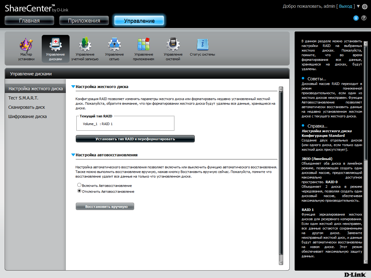 После выбора этого пункта на странице показываются семь значков. Про «Мастер установки» мы уже говорили выше. «Управление дисками» позволяет выбрать конфигурацию дисковых томов. Устройство поддерживает четыре варианта — два отдельных раздела и массивы JBOD, RAID0 и RAID1.