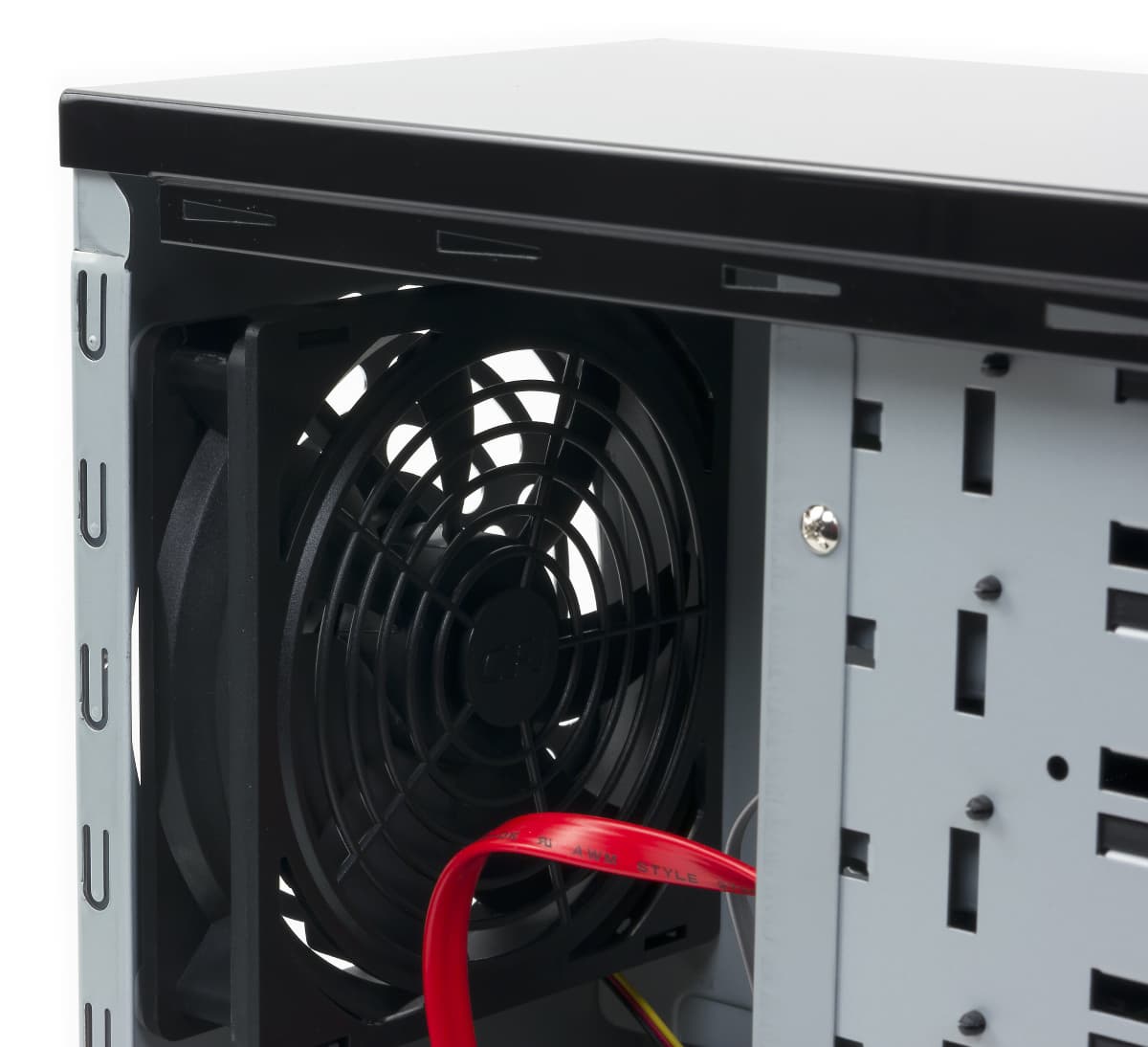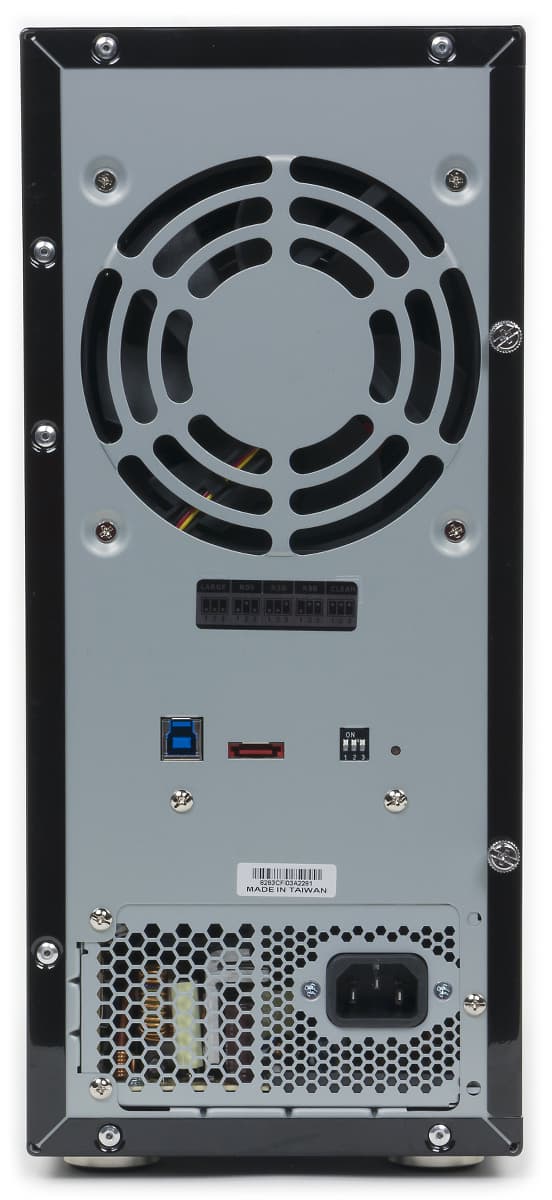 Система охлаждения состоит из основного 120-миллиметрового вентилятора Comdell DF1202512SEMN (12 В 0,20 А) и 80-миллиметрового вентилятора в блоке питания. Первый, к сожалению, не имеет возможности регулировки или контроля оборотов и постоянно работает на полной скорости (предположительно 1500 об/мин). На его остановку накопитель никак не реагирует, а вот пользователь, если он находится недалеко, сразу заметит существенное снижение уровня шума. Немного странным показалось наличие решеток в передней части боковых стенок. Из-за отсутствия средств контроля за температурой винчестеров сложно оценить температурный режим, но в случае с использованными в тесте WD Red проблем быть не должно.