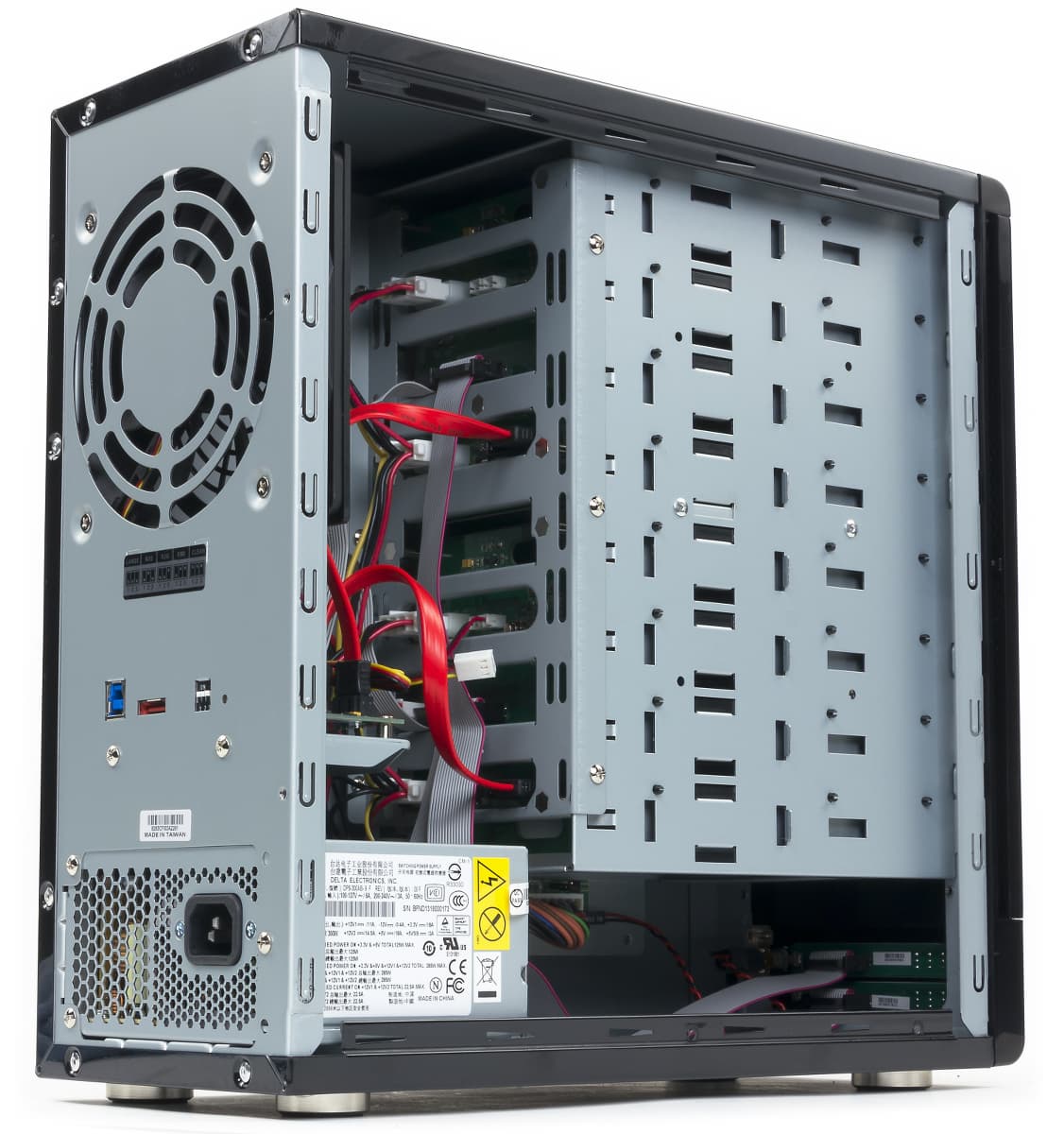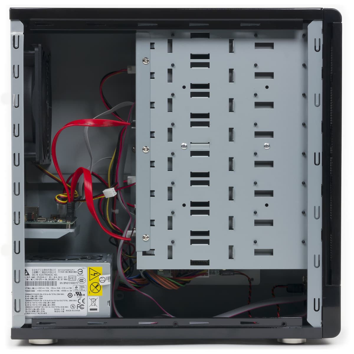 Накопитель имеет упрощенную конструкцию, когда часть внешнего корпуса также выступает и в роли рамы. Большинство элементов, включая корзину для винчестеров, изготовлены из 0,9-миллиметровой стали. Для доступа внутрь можно снять левую боковую крышку, которая держится на двух винтах, не требующих отвертки. Эта возможность может потребоваться для переключения конфигурации, а также для чистки или замены вентилятора. Детали корпуса скреплены заклепками и винтами.