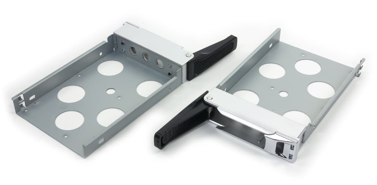 Для винчестеров поддерживается режим горячей замены. Перед установкой в корпус необходимо закрепить их на специальных рамках. Они имеют металлическое основание, защелку из пластика и возможность работы с дисками форматов 3,5″ и 2,5″. Никаких дополнительных замков не предусмотрено.
