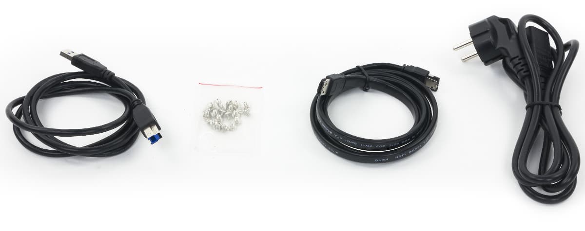 В него входят кабели питания, USB 3.0 и eSATA, комплект винтов и компакт-диск с документацией и ПО.