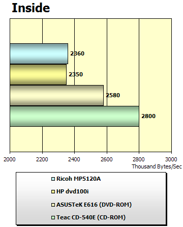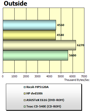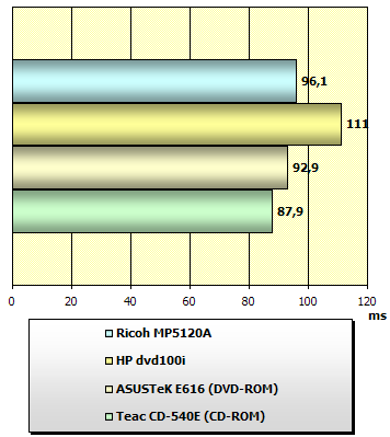 Используя Ricoh MP5120A в качестве рекордера CD-R, вы можете получить до минуты выигрыша по сравнению со стандартными CD-RW устройствами. HP dvd100i демонстрирует менее привлекательные показатели, хотя, также, более выигрышные на фоне результатов W512EB и NR-7700.