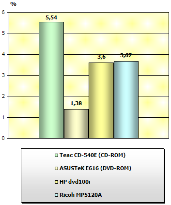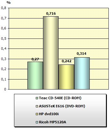 Скорость чтения DVD носителей у шестнадцатискоростного DVD-ROM ASUS конечно же выше, хотя и незначительно. При этом загрузка процессора E616-ым почти вдвое больше, чем dvd100i.
