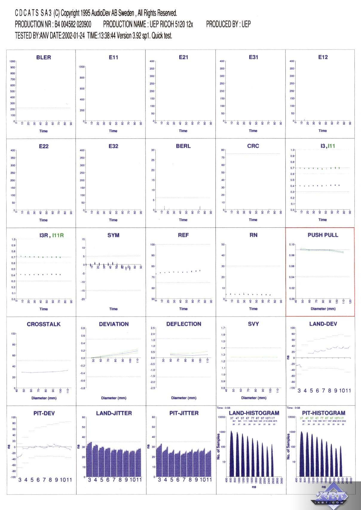 Чтение поврежденных CD-ROM дисков у Ricoh реализовано наилучшим образом (не смотря на то, что при нахождении трудночитаемой области на DVD носителе, рекордер был не в состоянии продолжить тестирование). Привод же от HP, уже при первом сбое снизил скорость до минимальной и сохранил ее до конца диска. Отсутствие даже малейших попыток восстановления скорости, может служить основанием для выводов о потенциальных затруднениях у dvd100i с чтением некачественных носителей.
