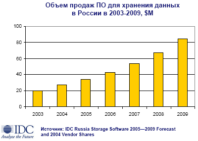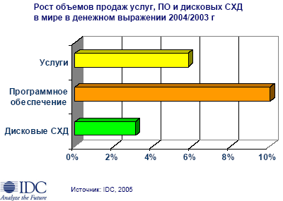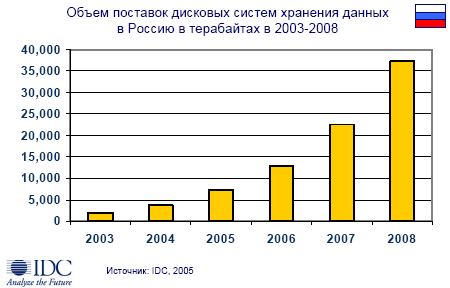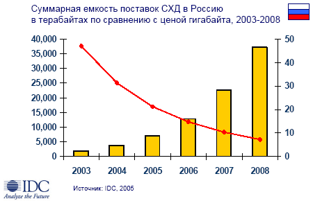 Хранение данных становится доступнее. По данным IDC Worldwide Disk Storage Systems 2005-2009 Forecast and Analysis, использование недорогих жестких дисков, ориентированных на емкость, в 2004 году превысило ожидания IDC. Согласно обновленному прогнозу, к 2009 году ими будет представлено более половины суммарной емкости дисковых систем хранения данных».