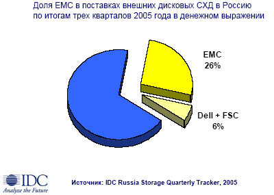 по результатам девяти месяцев 2005 года доля СХД, проданных под маркой EMC2, составила 27% от общих объемов продаж на российском рынке в денежном выражении. Еще большую долю EMC традиционно занимает в перспективном сегменте SAN (Storage Area Networks).