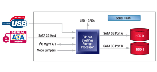 Как мы уже сказали, в устройстве применен чип SiI5744 от Silicon Image (такой, как в в StarBox Quantum, принципиальная схема которого приведена далее:
