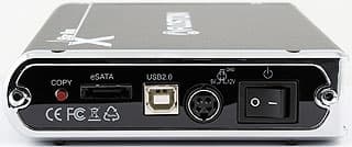 На задней грани можно обнаружить разъемы eSATA, USB (тип B) и питания (стандартный для Floston разъем mini-DIN 4). Также там находится выключатель питания и кнопка, обрабатываемая прилагаемой программой резервного копирования. А переключателя eSATA-USB (как на универсальной модели) нет — он больше не нужен, поскольку для реализации eSATA не нужны сложные схемы: контроллер поддерживает таковое соединение самостоятельно.