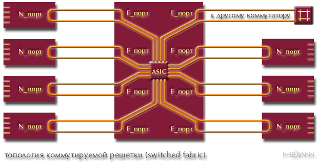 Наиболее перспективная топология, позволяющая преодолеть все ограничения петли с арбитражным доступом и представить каждому N_порту выделенный канал FC-AL. Как уже понятно из названия, в основу решетки положен Fibre Channel коммутатор с F_портами (Fabric ports).