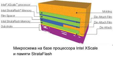 Еще более сложные конфигурации класса «все-в-одном» сейчас широко представлены такими компаниями как, например, Intel, Samsung, Hitachi и др. Их изделия представляют собой многофункциональные устройства, реализованные в одной лишь микросхеме (стандартно в ней имеется процессор, флэш-память и SDRAM). Ориентированы они на применение в мобильных устройствах, где важна высокая производительность при минимальных размерах и низком энергопотреблении. К таким относятся: PDA, смартфоны, телефоны для сетей 3G. Приведу пример подобных разработок — чип от Samsung, объединяющий в себе ARM-процессор (203 МГц), 256 Мбайт NAND памяти и 256 SDRAM. Он совместим с распространенными ОС: Windows CE, Palm OS, Symbian, Linux и имеет поддержку USB. Таким образом на его основе возможно создание многофункциональных мобильных устройств с низким энергопотреблением, способных работать с видео, звуком, голосом и прочими ресурсоемкими приложениями.