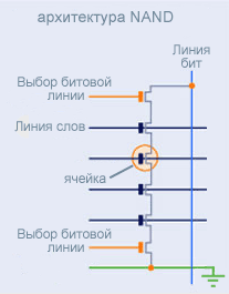 Устройство и принцип работы ячеек у нее такой же, как и у NOR. Хотя, кроме логики, все-таки есть еще одно важное отличие — архитектура размещения ячеек и их контактов. В отличие от вышеописанного случая, здесь имеется контактная матрица, в пересечениях строк и столбцов которой располагаются транзисторы. Это сравнимо с пассивной матрицей в дисплеях :) (а NOR — с активной TFT). В случае с памятью такая организация несколько лучше — площадь микросхемы можно значительно уменьшить за счет размеров ячеек. Недостатки (куда уж без них) заключаются в более низкой по сравнению с NOR скорости работы в операциях побайтового произвольного доступа.