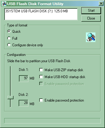 А что это дает простому пользователю? А пока ничего. На диске, прилагающимся к накопителю, удалось обнаружить набор утилит лишь для накопителей с интерфейсом USB 1.1, а для 2.0 — только драйвер под Windows 98 (теоретически в комплекте была еще утилита для парольной защиты, однако практически заставить ее работать мне не удалось). Кстати — для 1.1 предлагается воспользоваться старым добрым mFormat, причем, судя по внешнему виду, таким же, как в комплекте Transcend JetFlashA. Из этого можно сделать, что ранее неизвестный Prolific не новая фирма, а… сами угадаете кто ;)