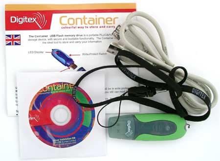 Содержит от 32 Мбайт до 1 Гбайт памяти (это если верить инструкции — судя по коробке линейка чуть короче: 64-512 Мбайт), как и другие накопители. Комплект поставки тоже совсем классический: накопитель, USB-удлинитель, 3,5″ CD с ПО и документацией, шнурок для ношения флэшдрайва на шее, да краткая инструкция на четырех языках.