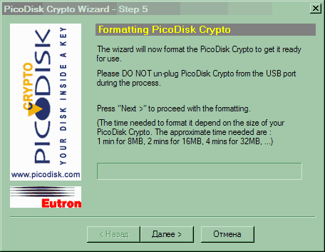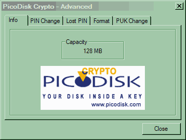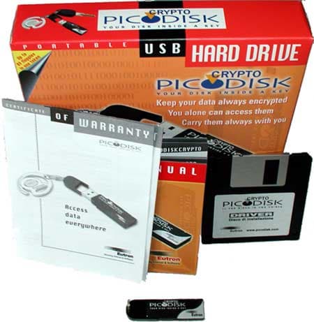 Первым номером сегодняшнего тестирования пойдет классический представитель первого поколения флэшдрайвов, требующий обязательной установки драйверов под любыми версиями Windows. Какой смысл тестировать его сейчас, когда уже есть что выбрать и из более удобных в повседневной жизни накопителей? Тому есть серьезная причина: Picodisk обеспечивает очень хорошую защиту информации. Причем речь идет не о парольной защите, которая уже стала привычной, а о полноценном шифровании с открытым ключом длиной 128 бит (используется алгоритм AES), чего более чем достаточно даже для промышленного применения (вообще говоря, алгоритмы с такой длинной ключа и поныне используются даже спецслужбами, так что остальным тем паче жаловаться не на что).