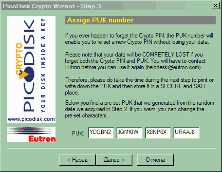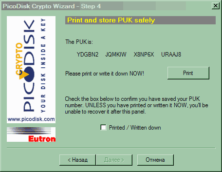 На следующем шаге нам показывают сгенерированный PUK-код и предупреждают о том, что его нужно обязательно запомнить или записать и хранить в защищенном месте. Забыв и PIN, и PUK не просто невозможно получить доступ к хранящимся на накопителе данным, но и вообще его использовать. Кстати, PUK можно ввести и свой (на этом шаге), однако делать это не рекомендуется, ибо защита будет существенно ослаблена подобным волюнтаризмом.