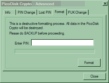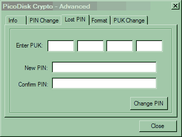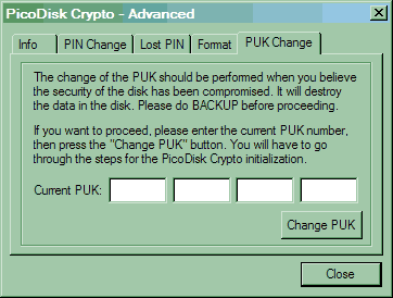 Пятая и последняя позволяет сменить PUK-код, если нам это потребуется. Учтите, что при этом изменяется ключ шифрования, так что накопитель переформатируется и все данные, естественно, теряются (поэтому большими буквами и написано о необходимости сделать бэкап). Введя текущий PUK-код и нажав кнопку «Change PUK», мы с самого начала снова проходим весь цикл инициализации устройства, описанный выше.
