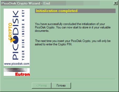 Впрочем, все когда-нибудь кончается, о чем свидетельствует следующее окошко. В нем нам сообщают, что процесс закончен и в дальнейшем для использования устройства нужно лишь помнить PIN-код.