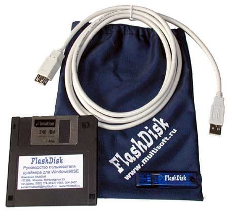 Впрочем, до подключения этого флэшдрайва незаметно, что он является находкой для майора Пронина и прочих. Перед нами практически стандартный комплект: в картонную коробку упакован сам накопитель, инструкция по эксплуатации, гарантийка и столь необходимая в данном случае дискета с драйверами и программным обеспечением. Удлинителя в комплекте нет, да он и не очень нужен, поскольку устройство очень компактное (в конце-концов, USB-удлинитель можно и отдельно приобрести, благо стоит он копейки).