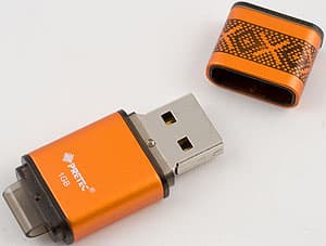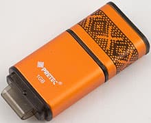 Внешне накопитель очень сильно напоминает предыдущую модель. Не размерами — они составляют 70×17×6 мм, хотя масса «прописана» аналогичная — 10 грамм, а формой. Те же строгие прямые линии, тот же колпачок, в рабочем состоянии фиксирующийся на задней части флэшдрайва, опять же, конкурирующий в данном случае за «место под солнцем» со шнурком для ношения устройства на шее или кольцом для ключей (если, конечно, вы таковые сами добудете — в комплекте ничего подобного нет, как и в предыдущем случае), даже орнамент на колпачке такой же. В общем, удлиненный почти вдвое Mambo и все тут :) И даже все та же присоска с зажимом в комплекте приложена, как и предыдущем случае. Даже лозунг «Store in Style» на упаковке в обоих случаях присутствует, а у других накопителей Pretec как-то не припоминается, чтоб такой был.