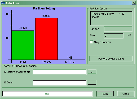 «Auto Run» несколько сложнее, чем может показаться из названия. Программа не просто делает какие-либо файлы автоматически выполняемыми, более того — делает она вообще не это :) Ее задача — превращать часть емкости накопителя в виртуальный CD-ROM, куда будет записан ISO-образ; готовый или сделанный самой программой на базе каталога с файлами. Разумеется, для CD автозапуск является штатной операцией очень давно, так что попутно мы и эту задачу решаем. Но не только ее: теперь есть возможность записывать стандартные ISO-образы. А также защищать от удаления и изменения важную информацию — для системы данный раздел выглядит как компакт-диск, причем массовые утилиты для работы с флэшками такой вот раздел удалить не могут. Даже если мы изменим конфигурацию разделов при помощи штатного «Flash Partition» созданные виртуальные CD-ROM останутся на месте — удалить их можно только при помощи самой «Auto Run».