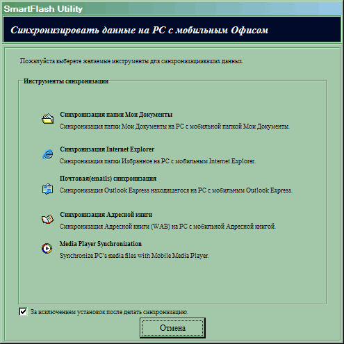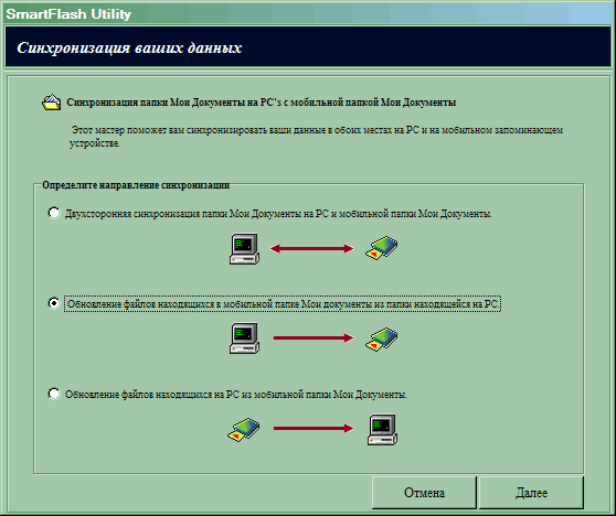 А эту задачу выполняет первая подгруппа из группы утилит. Впрочем, первоначальное копирование данных на флэшку можно сделать и без нее — при попытке «нажать» на «Мобильную папку» (или ссылку на любой другой такой каталог) будет предложено выполнить копирование информации с винчестера компьютера на флэш-накопитель. В последующем пригодятся утилиты синхронизации. Пользоваться ими легко и просто — ненужных вопросов нет, по сути, получаем нечто типа визардов системы.