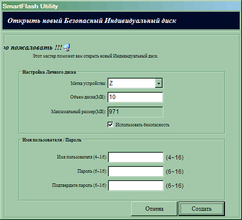 Вторая «кнопка» в левом столбце позволяет разбить накопитель не на два, а на три логических диска. Третий представляет собой специальный скрытый файл, зашифрованный 128-разрядным ключом, а работать с ним можно, как с диском, доступ к которому (после создания) осуществляется при помощи той «кнопки» — будет запрошен введенный ранее логин и пароль. Удобно здесь то, что и к открытой, и к защищенной части накопителя можно иметь одновременный доступ, что не всегда выполняется в случае многих конкурентов. И шифрование, а не простую парольную защиту тоже, разумеется, не стоит сбрасывать со счетов.