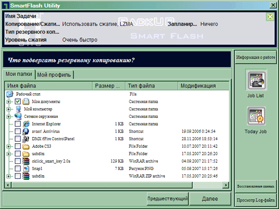 Необходимость резервного копирования информации тоже не обойдена вниманием производителя. Впрочем, для некоторых файлов и папок таковым можно считать и процедуры синхронизации (в данном случае вы, как минимум, будете иметь две копии данных — на компьютере и флэшке), но возможности именно утилиты резервного копирования чуть шире, чем простое пофайловое копирование. Настройка ее также (как и все остальное) интуитивно понятна. Для начала нужно создать задание (хоть одно). Самым важным является выбор того, что мы будем сохранять. Это могут быть любые файлы и папки или содержимое профиля пользователя (избранное IE и т. п.).