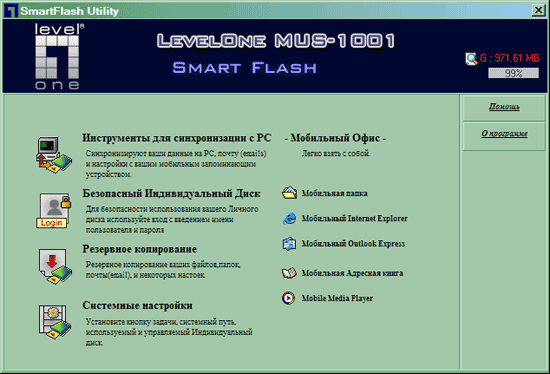 Знакомство с ПО начинается сразу после подключения накопителя к USB-порту компьютера. Он разбит на две части. Одна из них системе «представляется» как виртуальный CD-ROM, вторая — как собственно флэш-накопитель. Сделано это по двум причинам — во-первых, для CD есть автозапуск (то есть штатная программа может быть запущена сразу, при подключении устройства), во-вторых, он по-умолчанию защищен от записи (так что «загрузочный модуль» программы и утилиту восстановления «основного» удалить нельзя). Большая часть ПО, немудрено названного SmartFlash Utility, вместе с данными пользователя расположена на основной части флэшдрайва, что позволяет ее обновлять, при необходимости. А что будет, если пользователь случайно или нарочно отформатирует эту часть, либо вручную удалит нужные файлы? Ничего страшного — данная ситуация будет отловлена «загрузочным модулем», который предложит восстановить все остальное из архива на защищенной части. Это выгодно отличает MUS-1001 от накопителей с U3, где применено подобное разбиение — случайно удаленные установленные программы придется восстанавливать вручную. Здесь же все на автомате. Пусть и в том виде, который был при покупке флэшки, то есть апдейты ПО нужно будет сделать вручную.