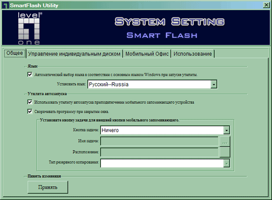 Что касается самого приложения в целом, то уважения как минимум заслуживает его перевод на разные языки, в том числе и на русский (по-умолчанию выбранным языком является тот, который установлен в системе), в то время как очень многие производители в сервисных утилитах своих флэш-накопителей ограничиваются исключительно английским языком. Русификация не без огрехов, однако, общее впечатление от нее положительное. Посмотрим, что нам предложено в качестве дополнительной функциональности.